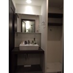 洗面台はシンプルかつデザイン重視のものを選定いたしました。化粧台本体の収納は少なめですが、三面鏡裏の収納を活用すれば問題なしです。