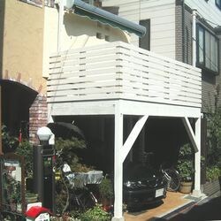 バルコニーの下が車庫になるので、雨除けにもなる様にしたいとの要望があり、それに対してはまず防水層をつくり、その上にデッキ材をスノコ状態で設置しました。その事によりデッキ材を通った雨水は防水層にたまり、1ヶ所から流し出すことができました。