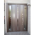 欄間を取り払い、開口高にあわせて扉の高さを高くし、柿渋調のデザインとあわせて、重厚感のある玄関に仕上げる事ができました。また、片開きのデザインをご希望されていましたので、扉の幅も最大限広げて有効開口幅を広くとりました。 防犯対策としては、両袖のFIX部分を防犯ガラスを採用しました。また、鍵はリモコンキーを採用しましたので、防犯性能のアップと共に、雨の日でもボタンひとつで解錠でき、鍵の開け閉めに手間取る事がありません。