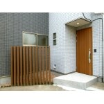 近代的なデザインタイルの外壁に対し、玄関ドアと玄関脇の目隠しを木の温もりが感じられるように仕上げました。