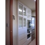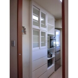 収納が充実した作り付けの食器棚をご希望でしたので、食器だけでなく、家電も収納できる食器棚をご提案しました。