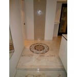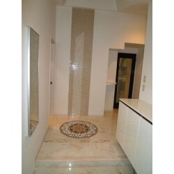 ご要望にお応えするため、明るく清潔感のある大理石をご提案させていただきました。また、モザイクサークルを施すことで高級感も演出させていただきました。