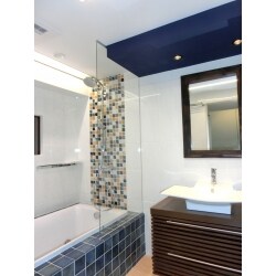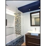 広々とした浴室をご希望されていらっしゃいましたので、浴室と洗面室をガラス間仕切りにて仕切りました。また、洗面室は碧い天井にスポットライトをあしらい、ホテルライクなイメージを演出致しました。