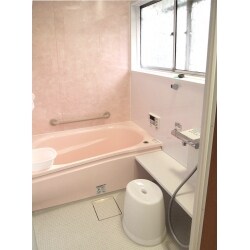 段差の解消と手すりで安全に移動ができるようになりました。またまたぎは一番使いやすい高さに。今までの少し寒々しいお風呂から一変ピンクがかわいいバスルームです。