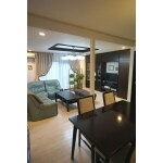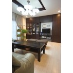 ダイニングとの間仕切りを撤去し、広いLDKとなりました。既存の造作家具を転用し、同じ面材で壁面収納を造作しました。