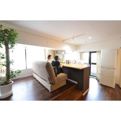 「本」と「食事」が好きなキャリアウーマンのM様。プライベートな時間を充実させるため、弊社にて街の中心部に中古住宅をご購入し、リノベーションを行いました。「キッチンを中心に、読書をしたり自分の時間を楽しみたい」というご要望からプランを練りました。キッチンに大きな無垢板でキッチンカウンターを造作し、本とお気に入りのスコッチを並べれるようになりました。さらにキッチンの隣の書斎には、造り付けの本棚を壁一面に造作しました。