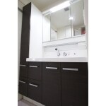 ご家族の日用品やストック品を全て隠せるよう、収納を多くしました。また、奥様のご希望で三面鏡を採用。