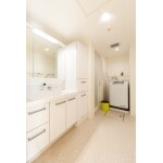 もともと広めの洗面所でしたが、キッチンのスペースと調整した結果、 洗面所のスペースは以前よりさらに広めになりました。 洗面台横には、洗濯機周りのものをすべて収納できるスペースを確保。