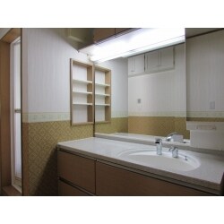 当初は洗面室の床の状態を改善したいとの事でご依頼いただきましたが、お打ち合わせの中で、洗面化粧台の交換工事をお任せいただきました。既存の洗面化粧台よりもカウンターが長くなり、朝の忙しい時でも2人同時に洗面化粧台が使えるようになりました。