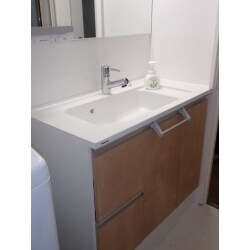 以前は洗面ボウルが大きく飛び出ているせいで洗面室の出入口の幅が狭くなっていましたが、奥行がスリムなPanasonic「Cライン」のスリムタイプをご提案したことで、洗面室の出入りがとてもスムーズになりました。 また、横に据えられていたキャビネットを撤去し、洗面化粧台の幅を広げ、広々と使い勝手の良い空間に生まれ変わりました。 床のクッションフロアや巾木も合わせて貼り直し、明るい空間になりました。