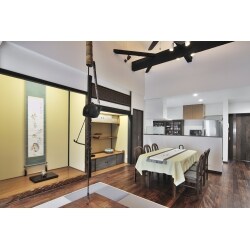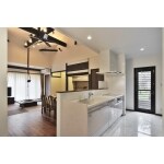 お二人暮らしとしては約50坪の平屋と大きく、ご希望だった家事室新設・洗濯機専用スペース・収納など生活の質を向上させられる自由な間取り設計が可能であった。 生活感ある部屋は専用スペースを作って隠し活かした空間造りを行った。また、使用頻度の高い勝手口からの、リビングや応接室はお互いが見えるよう開放的にしたゾーン分けにより、動線を見直し、各部屋への動線が短行った。使い勝手の向上と併せ、室内のデザイン性にもこだわり、くなるよう配置計画を広さを元々あった落ち付いた雰囲気の古民家風住宅となった。