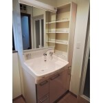 以前は、洗濯機の前に棚を置かれていました。収納が少なかったからと伺っていましたので、75センチの洗面化粧台に15センチのトールキャビネットの設置をご提案しました。薄型のタイプなら詰め替え用の洗剤やシャンプーをストックしておくのに最適なサイズです。上部は、オープンタイプの棚なので、よく使われる化粧品などが取り出しやすくなっています。洗濯機で洗えないお洋服を洗う事も多いとの事でしたので、ボール部分が深く洗いやすい物をご提案しました。
