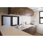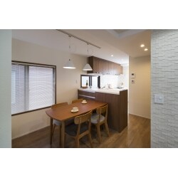 キッチンスペースには洗濯機置き場も設置し家事動線をコンパクトに、カフェ風なキッチンということで、タイル目地が印象的な 平田タイルをお勧めし採用しました。
