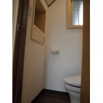 トイレを節水型に交換。壁は漆喰仕上げで快適スペース!窓枠を無垢材でカバーし埋め込み収納をシナランバー材で作成した自然素材を使用したトイレにしました