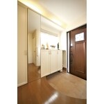 吹付断熱で、高気密・高断熱化を行い、さらに耐力壁などを用いて大幅な耐震補強も実施。玄関に入った瞬間、心地よい爽やかな温もりに包まれます。曲線と間接照明で美しく仕上げた玄関。正面に見える靴箱の並びは、一部に傘をスッキリ収められるスペースを提案しました。