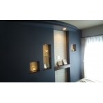室内全体の雰囲気を変えるポイントとして、照明計画・間接照明を付ける、部屋のどこかに丸を入れる、部分的に素材・色を変える、収納計画、といった提案のなかで、何処に何を取り入れるかの打合せを行い、イメージを創り上げました。 当初のご要望にはございませんでしたが、対面キッチンの提案をし、リビングの両サイドに読書・勉強用のカウンターテーブルを設置しました。お子様の成長を考えて可動式にしています。 リビング収納の奥行きに合わせて、裏面寝室のニッチの奥行きも変化させました。