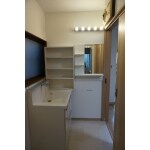 洗面台の前が窓になるので、下台だけで対応する商品をご提案いたしました。オープン棚が使いやすいと言うお客さまの使い勝手を最大限反映できるよう既存家具をお取付させていただきました。