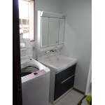腐食していた床はクッションフロアを張り、壁・天井のクロスも貼替え洗面脱衣室を一新しました。新しい洗面化粧台は洗いやすくゆったりとして作業のしやすい洗面ボウルと、たっぷり収納できるキャビネットが魅力的です。