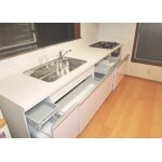 とても丁寧に補修されてお使いになっていたキッチンですが、とうとう寿命が来てしまいました。メンテナンス性も含めて、TOTOのキッチンをご提案させて頂きました。床もだいぶ傷みが出ており、全面フローリング、壁紙交換を施工させて頂きました。【キッチン単体工事約85万円 内装工事別途】