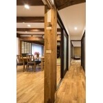 玄関ホールをゆったり取り、部屋の中まで入らずともちょっとしたおしゃべりできる空間を作った。無垢フローリングやしっくいといった自然素材をふんだんに使い快適な空間を作った。昔ながらの木造住宅なため、天井高が梁を見せないと取れず、それが逆にアクセントとなりました。