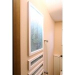 奥様の誕生花をデザインした彫刻ガラスを使用し、ガラスの後ろから照明がつくようにして、窓の光とは別に穏やかな明かりがともるようにしました。