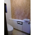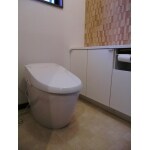 もともと美しいトイレでしたが、もっと快適な空間にリフォームさせて頂きました。 便座は、お掃除が楽でいつでも清潔を保てるフォルムのサティスG。タンクレスでスッキリしているのはもちろん、人が近づくとフタが自動開閉したり、ライトが灯ったりと、機能満載のトイレです。組み合わせた手洗いキャビネットは、キャパシアを採用して頂きました。たくさんの収納があり、すっきりと清掃用品も片付けられます。手洗いは丸型の優しいデザインを選択されました。 さらに壁にはエコカラットプラスを貼り、美しさだけでなく、気になるニオイや湿度も吸収してくれ、何もかもが快適で美しい空間に生まれ変わりました。