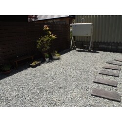 瓦礫や玉石、大きな木の根などで荒れた庭を、除草シート、化粧砂利を敷き石庭風に整備した。