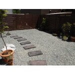 木の根や、瓦礫や玉石を取り除きスギナ対応の除草シートを敷き、玉石を敷いて石庭風にした。