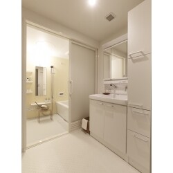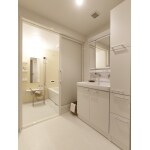 浴室及び洗面化粧台のスペースを広く明るくする為に、白系の壁材・設備機器の扉の色で統一しました。