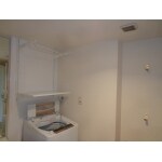 収納棚を設置するための下地造りをさせて頂きました。 設置した収納棚(写真:洗濯機上部)やフック(写真:手前)は お客さまの支給品です。