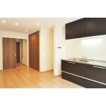 大理石調のフロアでキッチンが別空間に