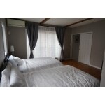 以前は子世帯リビングだった所をそっくりそのまま主寝室にしましたので贅沢なくらい広いお部屋となりました。構造上抜けない柱が残っています。また、隣家が隣接しているため窓を小さくしベッドの配置に合わせたレイアウトしました。