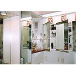 狭いスペースにより多くの収納を希望されましたので既存間仕切り壁を最大に利用しました。また狭いスペースを広い感覚にするため戸扉に鏡を付けました。