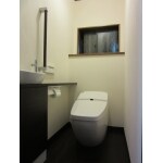 将来の使いやすさを考え、手すりと洗面カウンターを設置しました。トイレ本体は上質な素材と繊細なデザイン、優れた機能性のLIXIL最高級トイレ『レジオ』をご提案しました。お客様も大変喜んでくださり、デザインと質感にこだわりのある洗練されたトイレ空間に生まれ変わりました。