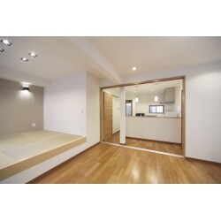 和室だった空間を、間取り変更をし、リビングと一体になった和スペースに改装しました。 畳のスペースを小上がりにし、リビングと高低差をつけることにより、広い空間に立体感や奥行きが生まれます。 小上がりを利用して、来客のときに座ってもらったり、小上がりの下に収納したりと、用途が広がります。