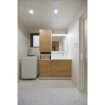 押入れだった部分を洗面脱衣室に取り込み、広々としたスペースになりました。 洗面台の横に設置したキャビネットは、小物やストック類を収納するのに便利です。 また、扉柄は明るい木目調に揃え、シンプルで明るい空間になりました。