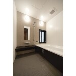 正面の壁パネルは、天然石をイメージしたデザインをお選びいただき、全体的にモノトーンにまとめ、落ち着いた印象に仕上げました。 お湯が冷めにくい浴槽、独自の断熱層で冷たさを感じにくい床で、冬場も快適にお使いいただけるようになりました。 シックで落ち着いた印象になり、快適で心地いい浴室にご満足いただきました。
