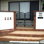 装飾性塗材ジョリパットの白い塗り壁と、淡いオレンジ色のレンガが見事に調和した外構壁。また重厚感のある門扉(鋳物製)のモスグリーンと白の塗り壁のコントラストが美しく映え、存在感のあるエクステリアとなりました。 ゆるやかな曲線を描いた外構壁とステップがお客様を優しくお出迎えすることでしょう。 イメージ通りの外構が完成し、ご主人様にご満足いただいています。