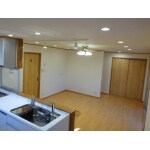 シーリングファンとダウンライトが輝きを放つショールームのようなLDKが完成しました。