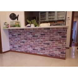 各部屋1面だけですが壁紙を替え、以前とは雰囲気がガラリと変わりました。キッチンの腰壁はレンガ調の壁紙にし、カフェのような雰囲気に。ペットにかじられた箇所もすっかり綺麗に直りました。【サンゲツRESERVE1000 7440】
