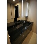 バスルームに合わせて黒を基調とした洗面に入替えました。 大きくなったフェイスライト付きの鏡で、お顔が見えやすくなりました。