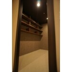 主寝室に隣接した洋室をウォークインクローゼットとして収納システムを造り付けしました。 また、黒の壁クロスを貼り、ガラスケースのコレクションやお洋服が見映え良くなるようにしました。