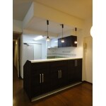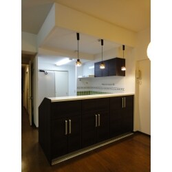 壁を取り払い、開放的なキッチンに。 照明もこだわりのペンダントライトを設置しました。リビング側からも収納できます。 落ち着いた茶色が緑色のタイルともマッチしています。