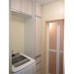 まず「収納力」を一番おっしゃっておられましたので、脱衣場の両サイドに洗面台と同じシリーズの棚をご提案いたしました。上部の吊り戸棚は両側全面です。洗濯機のスペースを確保して、洗剤や交換用のタオル置き場などにも配慮いたしました。