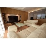 以前の印象とは全く異なり、明るく広々リビングとなりました。天井も折上げ天井として、天井の高さも以前より高くしております。TVも壁面収納にてスッキリとしております。高級感のある木質感を出し、収納扉も余計な金具も無くしスッキリとして、一見収納が無い様な家具収納としております。