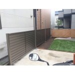 高さのある目隠しフェンスに、上段には半透明パネルで光を取り入れるタイプのポリカーボネートパネル、下段は風も通るルーバー式のアルミパネルをご提案し、お隣の窓を塞がない様に段差をつけた目隠しフェンスを設置しました。