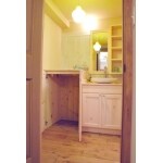 ナチュラルなイメージの洗面台はパイン材を使用したオリジナル。 左側のスペースは扉つきで洗濯機を隠せるようになっています。 上部はカウンターになっていて、作業台としても使用可能です。 カウンターは跳ね上げ式になっているので、洗濯機使用時にも邪魔になりません。