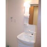 インテリア性の高い木目の扉で落ち着いた洗面所
