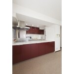 - 赤の対面キッチンで空間を彩る
