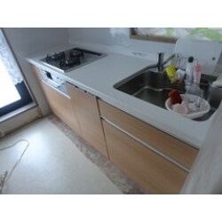 排水の面でのお悩みもあり、交換のご提案をさせていただきました。違和感のないよう、食器棚の扉の色と統一させ、また扉の表面は鏡面タイプ、カウンターは人工大理石をご提案させていただき、お掃除しやすく華やかなキッチンになりました。